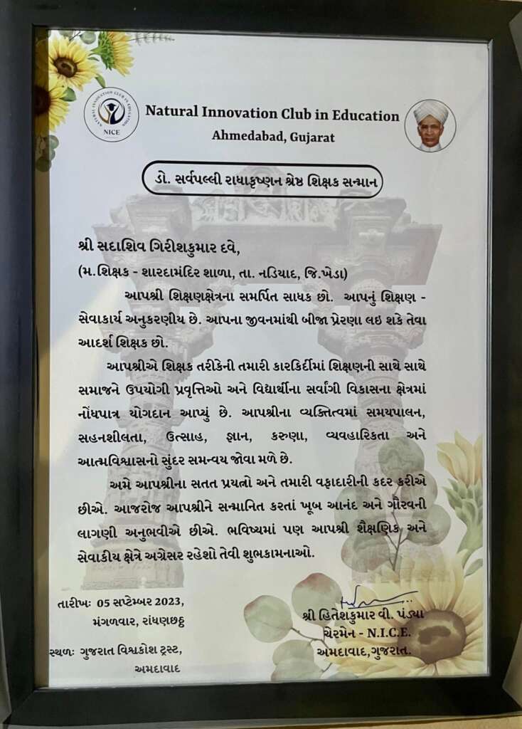 At ShivNaad, we proudly celebrate the achievements of our guiding force, Shri Sadashiv Girishkumar Dave. He received the Dr. Sarvepalli Radhakrishnan Best Teacher Award from N.I.C.E, Ahmedabad.