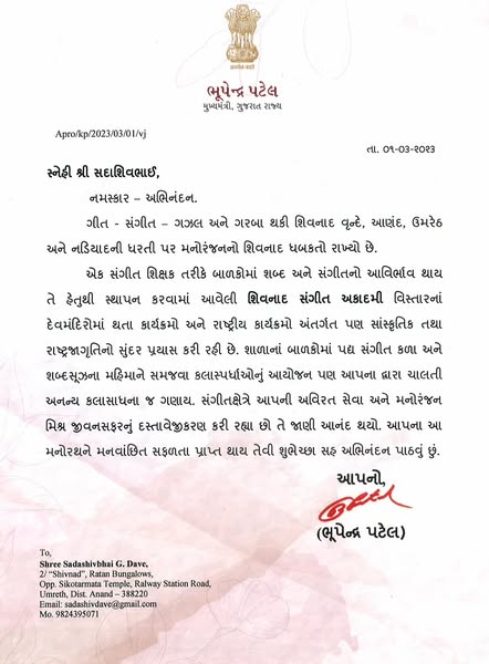 We are deeply humbled and delighted to share a proud moment in the journey of ShivNaad Events and ShivNaad Sangeet Academy — a heartfelt letter of recognition and appreciation from the Honorable Chief Minister of Gujarat, Shri Bhupendra Patel.